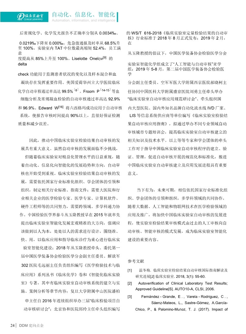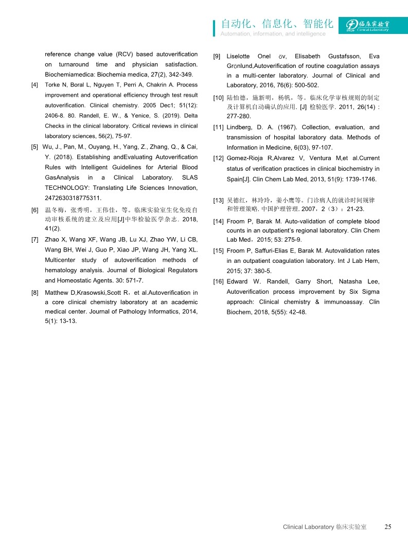 隨著臨床實驗室信息化自動化的迅速進展,計算機自動審核逐漸受到重視,國外實驗室自動審核的使用率較高,但國內(nèi)近幾年才開始發(fā)展使用,如何設(shè)置規(guī)范、全面、周全的自動審核規(guī)則?以何為載體設(shè)置?如何驗證?如何管理?已成為許多擬開展自動審核工作的實驗室迷惑及亟需掌握的共同問題。該報告主要針對AUTO-10A 指南進行詳細解讀解析、結(jié)合指南發(fā)表后國內(nèi)外不同專業(yè)領(lǐng)域自動審核的研究進展進行闡述和介紹,提出重要見解,為臨床實驗室開展自動審核工作提供借鑒和幫助。