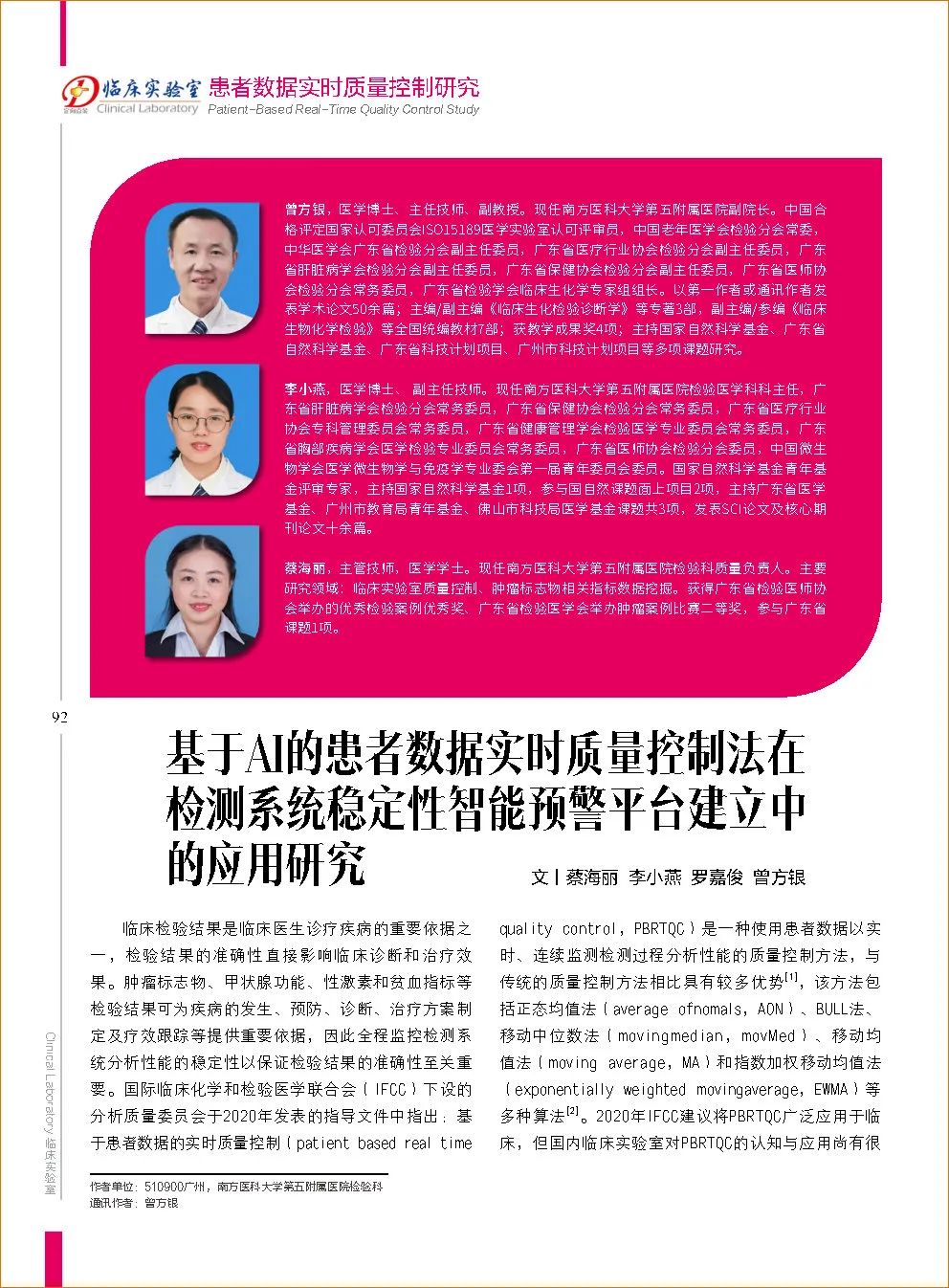 《臨床實(shí)驗(yàn)室》2022年第8期智能化??O(shè)置“患者數(shù)據(jù)實(shí)時(shí)質(zhì)量控制研究”專欄,南方醫(yī)科大學(xué)第五附屬醫(yī)院副院長曾方銀教授團(tuán)隊(duì)分享了《基于AI的患者數(shù)據(jù)實(shí)時(shí)質(zhì)量控制法在檢測(cè)系統(tǒng)穩(wěn)定性智能預(yù)警平臺(tái)建立中的應(yīng)用研究》研究成果,本研究基于人工智能技術(shù)開發(fā)的PBRTQC實(shí)時(shí)在線智能監(jiān)控平臺(tái)在監(jiān)控化學(xué)發(fā)光檢驗(yàn)領(lǐng)域質(zhì)量風(fēng)險(xiǎn)識(shí)別與管理的臨床應(yīng)用研究。此外,評(píng)價(jià)基于AI的PBRTQC多參數(shù)模型與傳統(tǒng)的PBRTQC模型在真實(shí)世界質(zhì)量誤差識(shí)別靈敏度及特異性等質(zhì)控效能的比較。全文詳見如下: