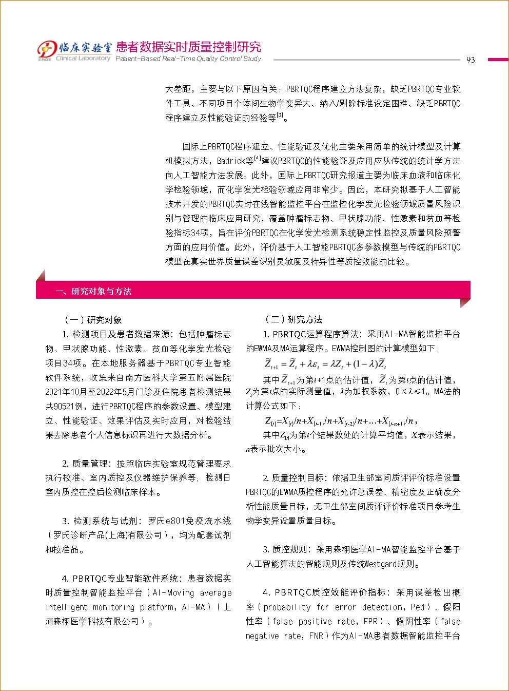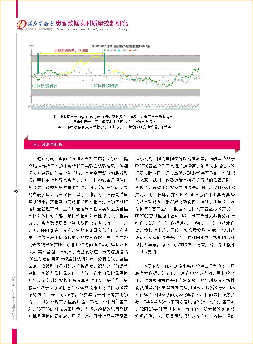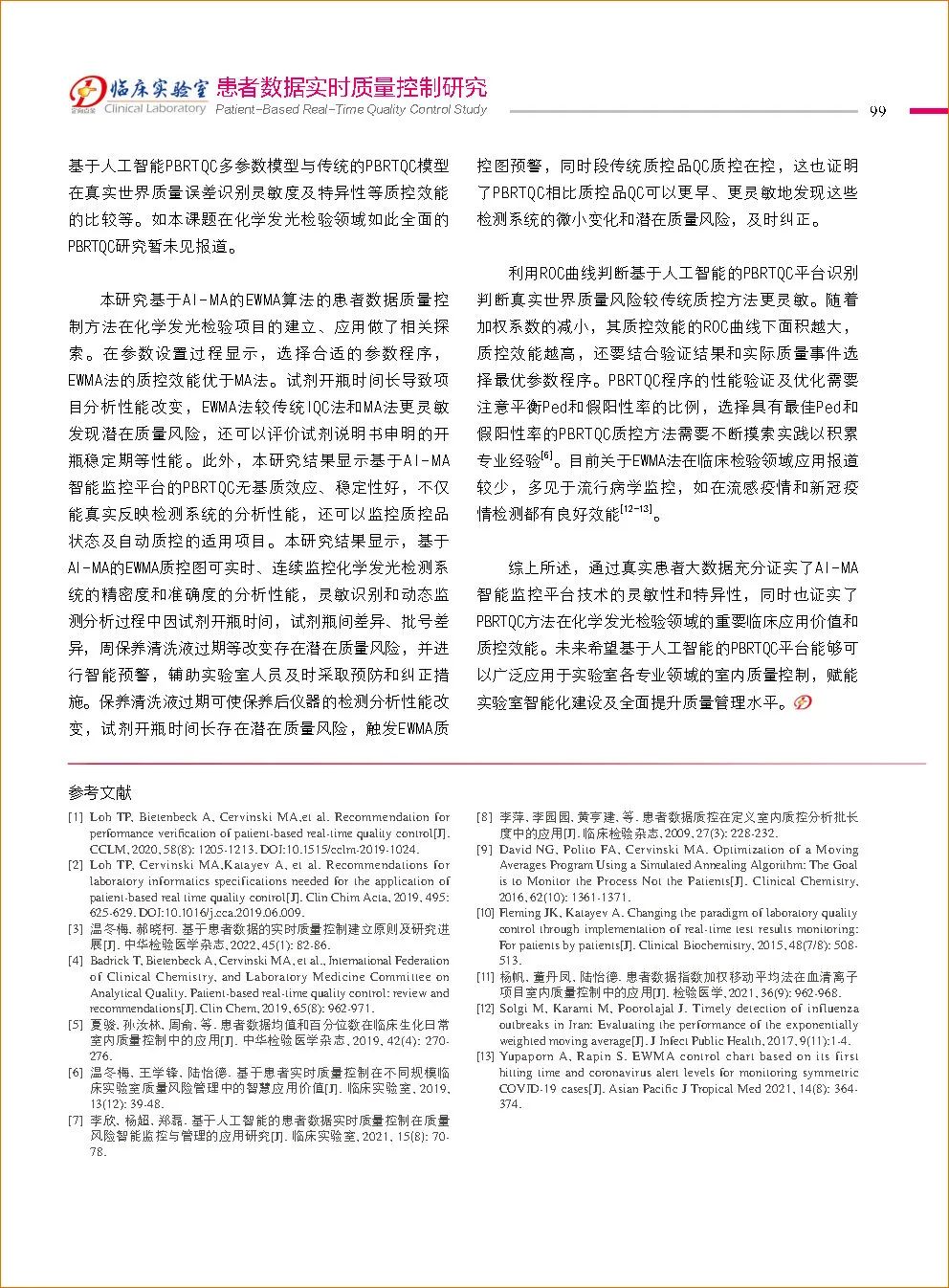 國際臨床化學(xué)和檢驗(yàn)醫(yī)學(xué)聯(lián)合會(huì)(IFCC)下設(shè)的分析質(zhì)量委員會(huì)于2020年發(fā)表的指導(dǎo)文件中指出:基于患者數(shù)據(jù)的實(shí)時(shí)質(zhì)量控制(patient based real time quality control,PBRTQC)是一種使用患者數(shù)據(jù)以實(shí)時(shí)、連續(xù)監(jiān)測(cè)檢測(cè)過程分析性能的質(zhì)量控制方法,2020年IFCC建議將PBRTQC廣泛應(yīng)用于臨床,但國內(nèi)臨床實(shí)驗(yàn)室對(duì)PBRTQC的認(rèn)知與應(yīng)用尚有很大差距,國際上PBRTQC程序建立、性能驗(yàn)證及優(yōu)化主要采用簡單的統(tǒng)計(jì)模型及計(jì)算機(jī)模擬方法,Badrick等建議PBRTQC的性能驗(yàn)證及應(yīng)用應(yīng)從傳統(tǒng)的統(tǒng)計(jì)學(xué)方法向人工智能方法發(fā)展。